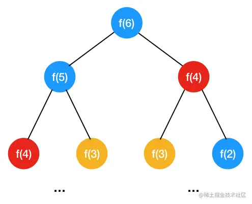 可以看到光是求 f(6),就有两次重复的计算, f(4) 求解了两次,f(3) 求解了两次,时间复杂度是指数级别,递归时间复杂度怎么看,解决每个子问题需要的时间乘以子问题总数,每个子问题需要的时间即 f(n) = f(n-1) + f(n-2) 只做了一次加法运算,子问题的个数有多少呢,每个问题一分为二,是个二叉树,可以看到第一层 1 个,第二层 2 个,第三层 4 个,即 1 + 2 + 2^2 + .... 2^n,所以总的来说时间复杂度是)O(2^n),是指数级别