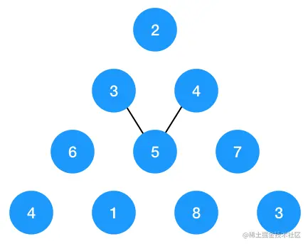 重点来了,如何采用自底向上的动态规划来解决问题呢? 我们这么来看,要求节点 2 到底部边的最短路径,只要先求得节点 3 和 节点 4 到底部的最短路径值,然后取这两者之中的最小值再加 2 不就是从 2 到底部的最短路径了吗,同理,要求节点 3 或 节点 4 到底部的最小值,只要求它们的左右节点到底部的最短路径再取两者的最小值再加节点本身的值(3 或 4)即可。