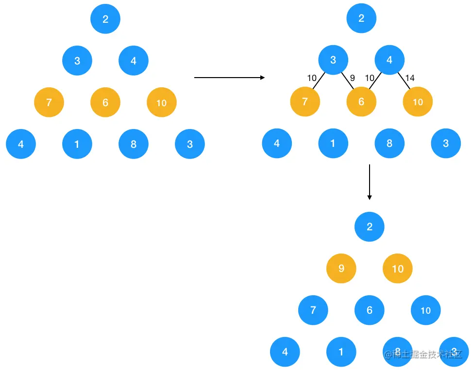 同理,第二层对于节点 3 ,它到最底层的最短路径转化为了 3 到 7, 6 节点的最短路径的最小值,即 9, 对于节点 4,它到最底层的最短路径转化为了 4 到 6, 10 的最短路径两者的最小值,即 10。