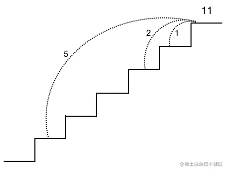 凑零钱这道题还可以用另外一道经典的青蛙跳台阶的思路来考虑,从最底部最少跳多少步可以跳到第 11 阶,一次可以跳 1,2,5步 。由此可知最后一步一定是跳 1 或 2 或 5 步,于是如果用 f(n) 代表跳台阶 n 的最小跳数,则问题转化为了求 f(n-1),f(n-2) ,f(n-5)的最小值。