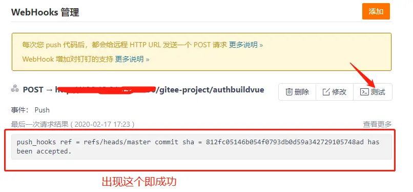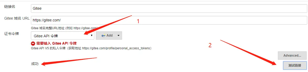 添加完后选择刚才添加的令牌,然后点击测试连接,如果出现成功则连接成功,到这里,gitee的配置就配置完了