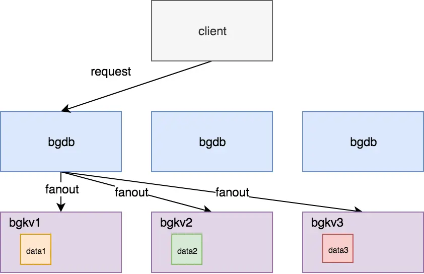 - 并根据一定的路由规则(例如一致性哈希)找到目标数据所在的存储节点(bgkv),将执行计划中的读写请求发送给 多个 bgkv;