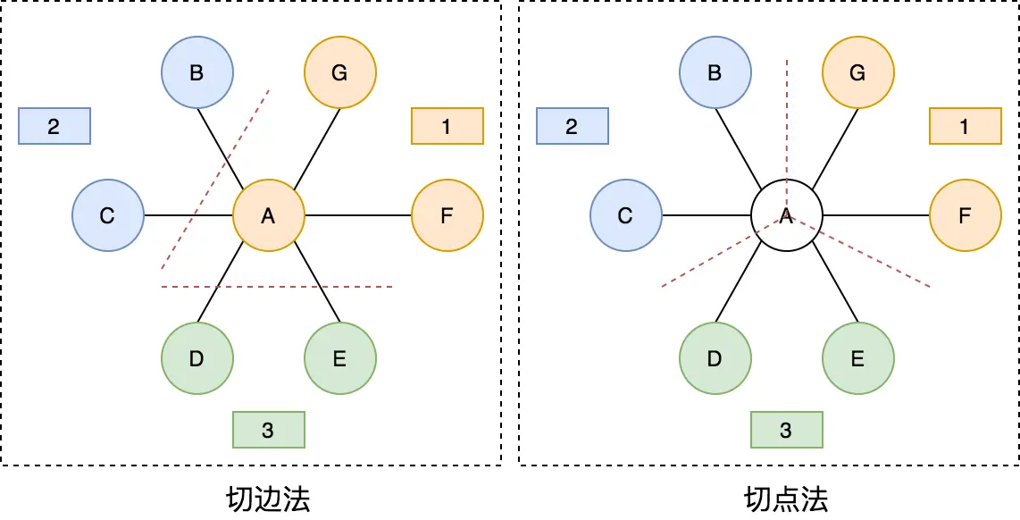 切边法顾名思义,会从一条边中间切开,两边的节点会分布在不同的图分区,每个节点全局只会出现一次,但切边法可能会导致一条边在全局出现两次。如上左图所示,节点 A 与节点 B 之间有一条边,切边法会在 A 和 B 中间切开,A 属于图分区 1,B 属于图分区 2。