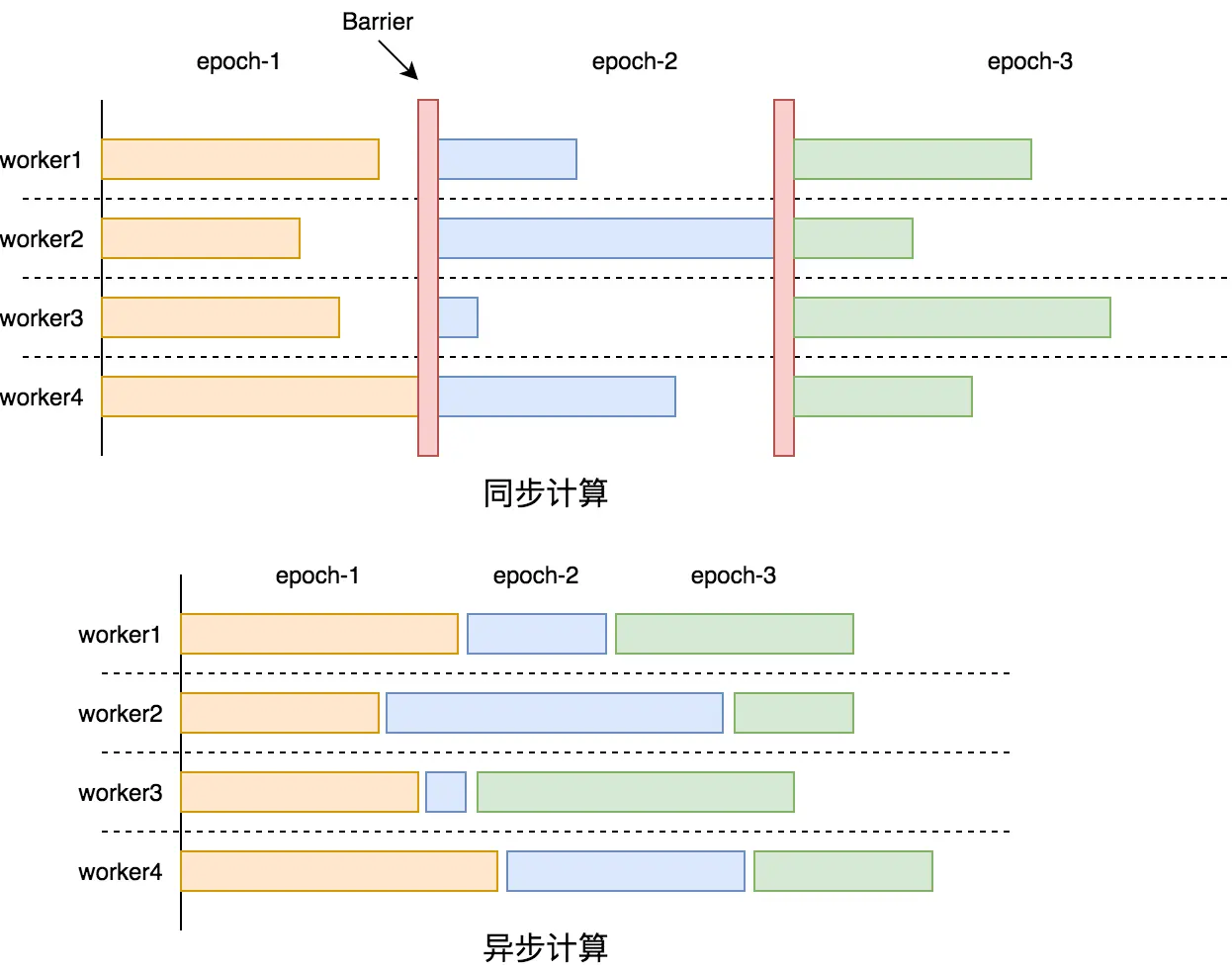 半同步计算是两者的综合,其思想是允许一定的不同步,但当计算最快的节点与计算最慢的节点相差一定迭代轮数时,最快的节点会进行等待。 同步计算和异步计算的示意图如下图: