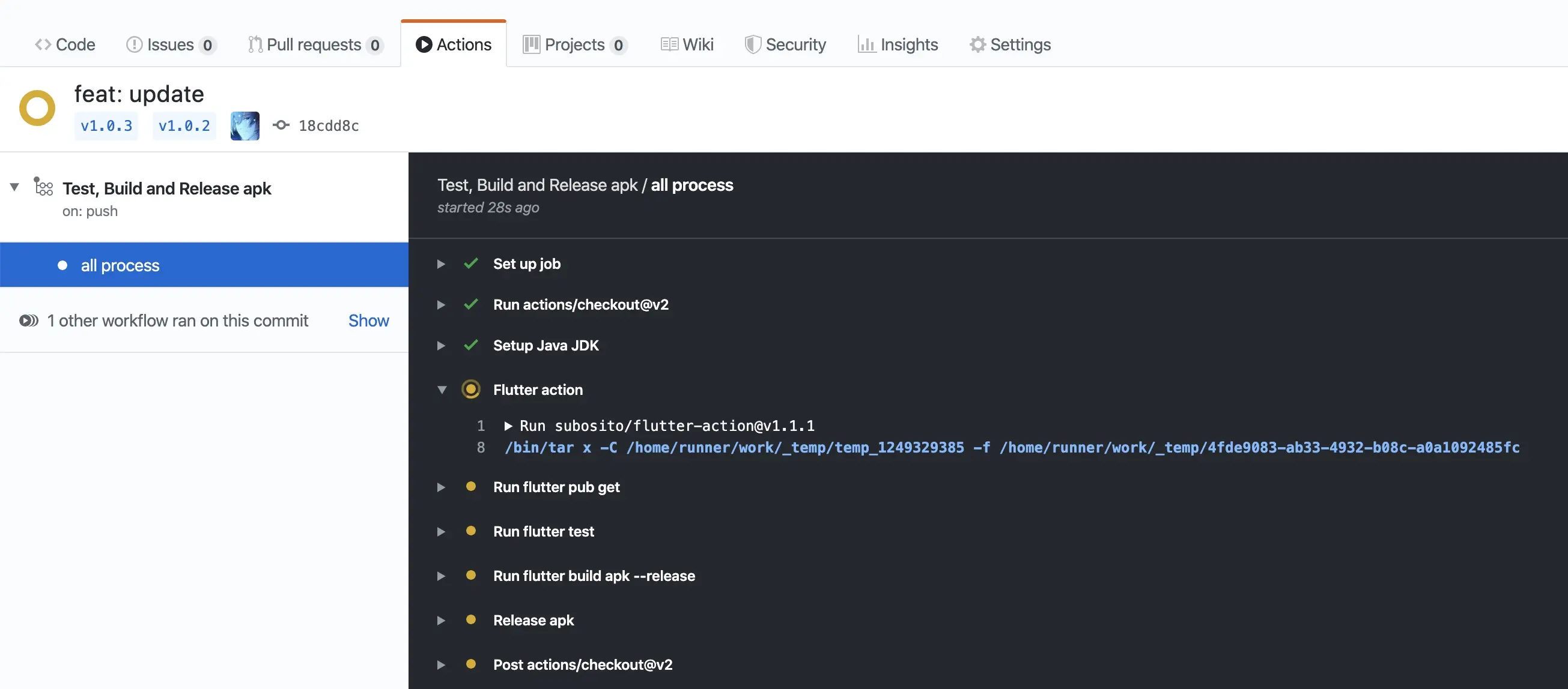 然后就可以在仓库的 Actions 里面看到正在运行的工作流程了