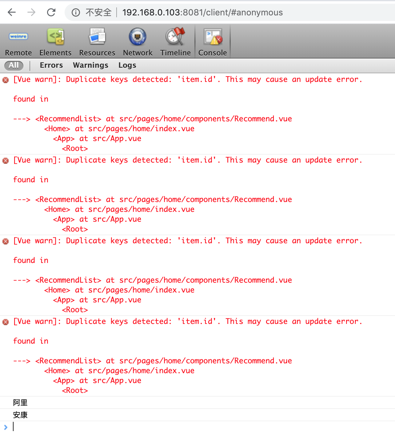 192.168.0.103:8081的 console面板看到log了。