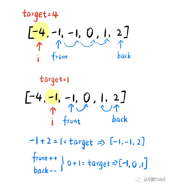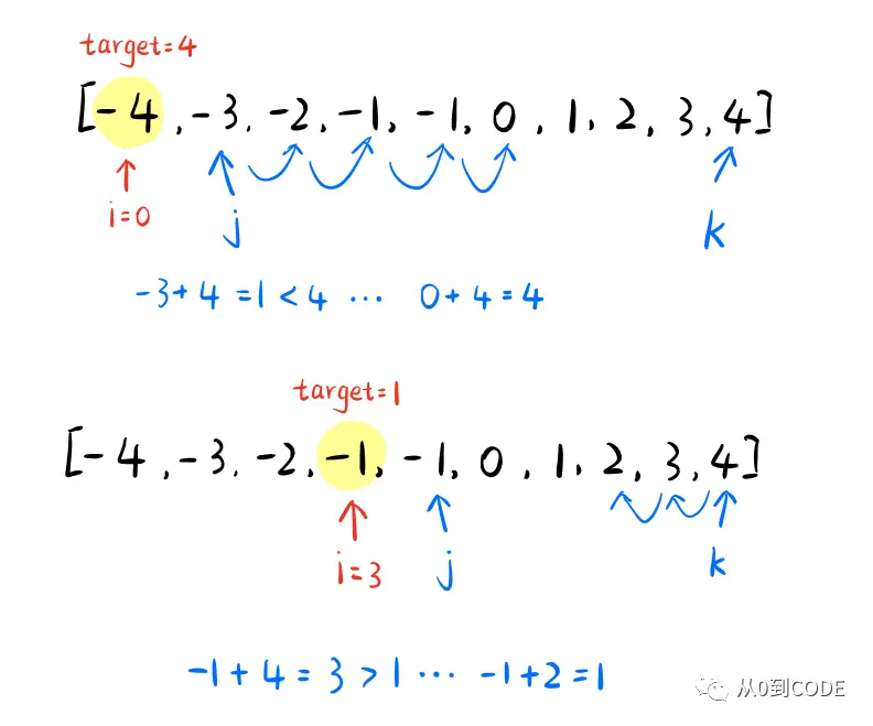 同样,当i=3时,对应target=1,指针j和k首先位于右侧数组两端,其元素和 -1+4=3>1 ,于是我们将处于右边的指针向左挪动,直到找到 -1+2=1 时j和k的位置,最后将i,j,k一同返回。