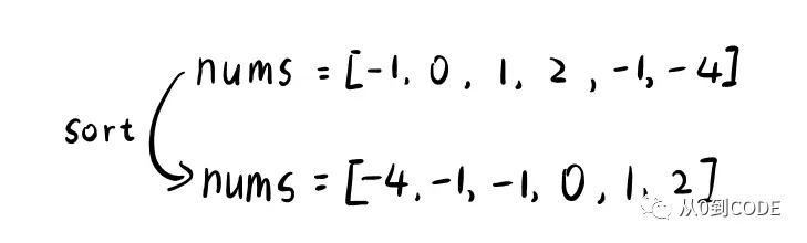 给定数组 nums = [-1, 0, 1, 2, -1, -4] 满足要求的三元组集合为: