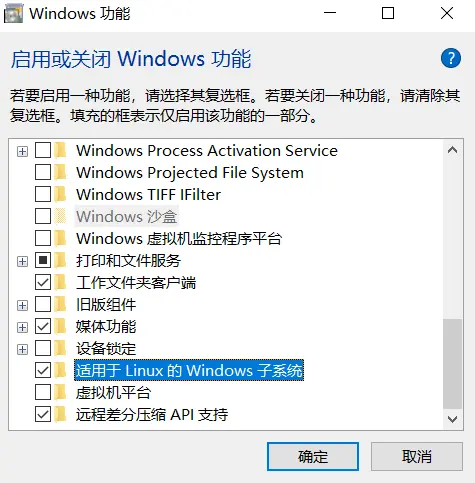 - 找到程序和功能选项,点击 启用或关闭Windows功能 ,勾选 适用于Linux的windows子系统
