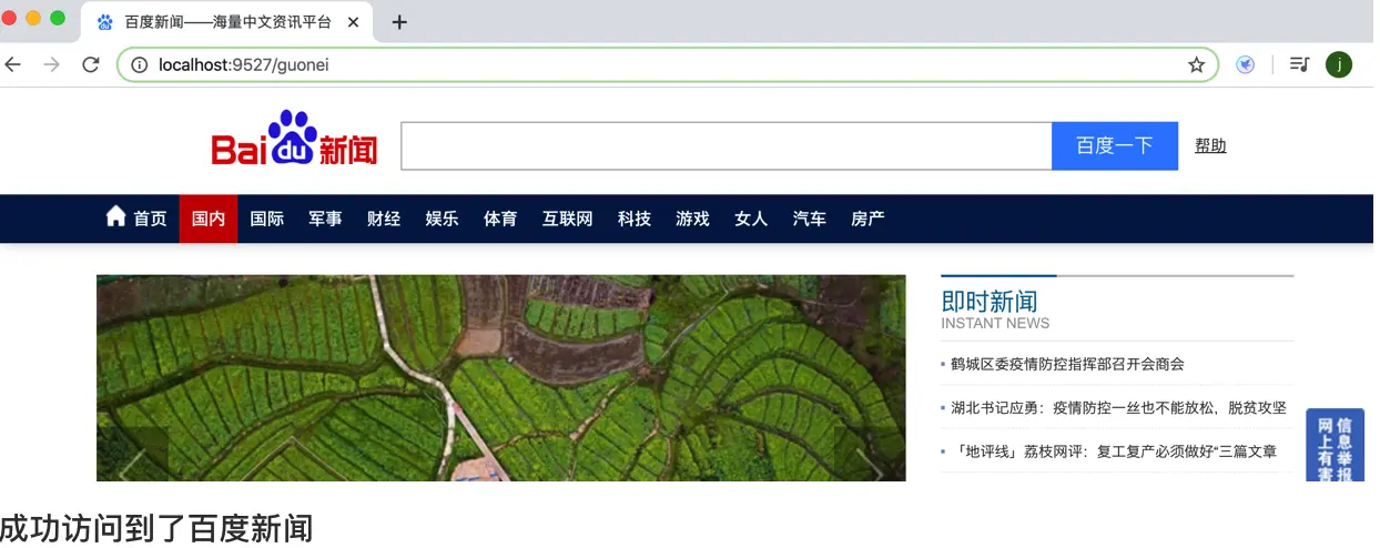 * 当访问地址http://localhost:9527/guonei时会自动转发到地址 http://news.baidu.com/guonei