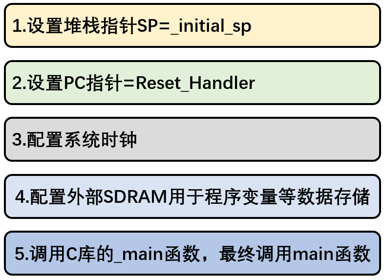 CPU 从 PC 寄存器指向的物理地址取出第 1 条指令开始执行程序,也就是开始执行复位中断服务程序 Reset_Handler。复位中断服务程序会调用SystemInit()函数来配置系统时钟、配置FMC总线上的外部SRAM/SDRAM,然后跳转到 C 库中__main 函数。由 C 库中的__main 函数完成用户程序的初始化工作(比如:变量赋初值等),最后由__main 函数调用用户写的 main()函数开始执行 C 程序。