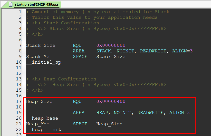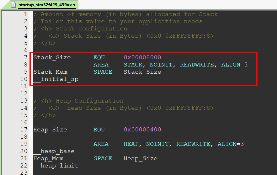 第 9 行:SPACE 这行指令告诉汇编器给 STACK 段分配 0x00000800 字节的连续内存空间。 第 10 行: __initial_sp 紧接着 SPACE 语句放置,表示了栈顶地址。__initial_sp 只是一个标号,标号主要用于表示一片内存空间的某个位置,等价于 C 语言中的“地址”概念。地址仅仅表示存储空间的一个位置,从 C 语言的角度来看,变量的地址,数组的地址或是函数的入口地址在本质上并无区别。