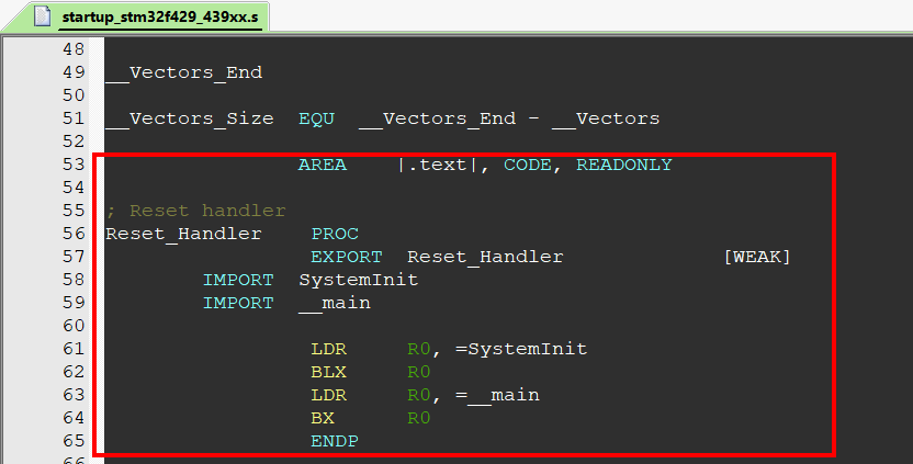 第 57 行:WEAK 声明其他的同名标号优先于该标号被引用,就是说如果外面声明了的话会调用外面的。 这个声明很重要,它让我们可以在 C 文件中任意地方放置中断服务程序,只要保证 C 函数的名字和向量表中的名字一致即可。
