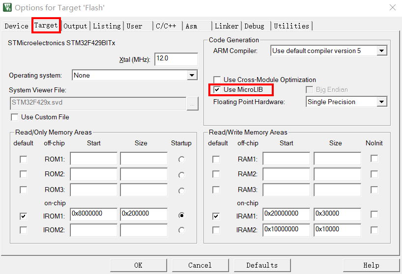 局外话,这一步的配置工作很重要,很多人串口用不了 printf 函数,编译有问题,下载有问题,都是这个步骤的配置出了错。Target中选中微库“ Use MicroLib”,为的是在日后编写串口驱动的时候可以使用printf 函数。而且有些应用中如果用了 STM32 的浮点运算单元 FPU,一定要同时开微库,不然有时会出现各种奇怪的现象。FPU 的开关选项在微库配置选项下方的“Use Single Precision”中,默认是开的。
