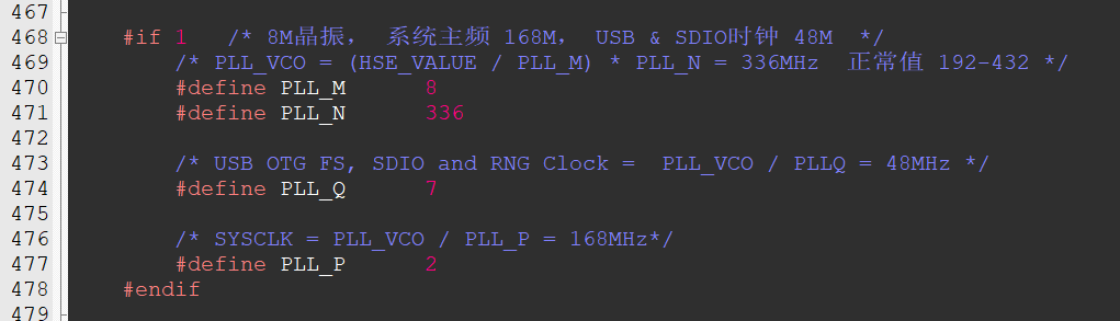 如果我们选择HSE为PLL时钟源,同时SYSCLK时钟源为PLL,那么SYSCLK时钟为 168MHz。