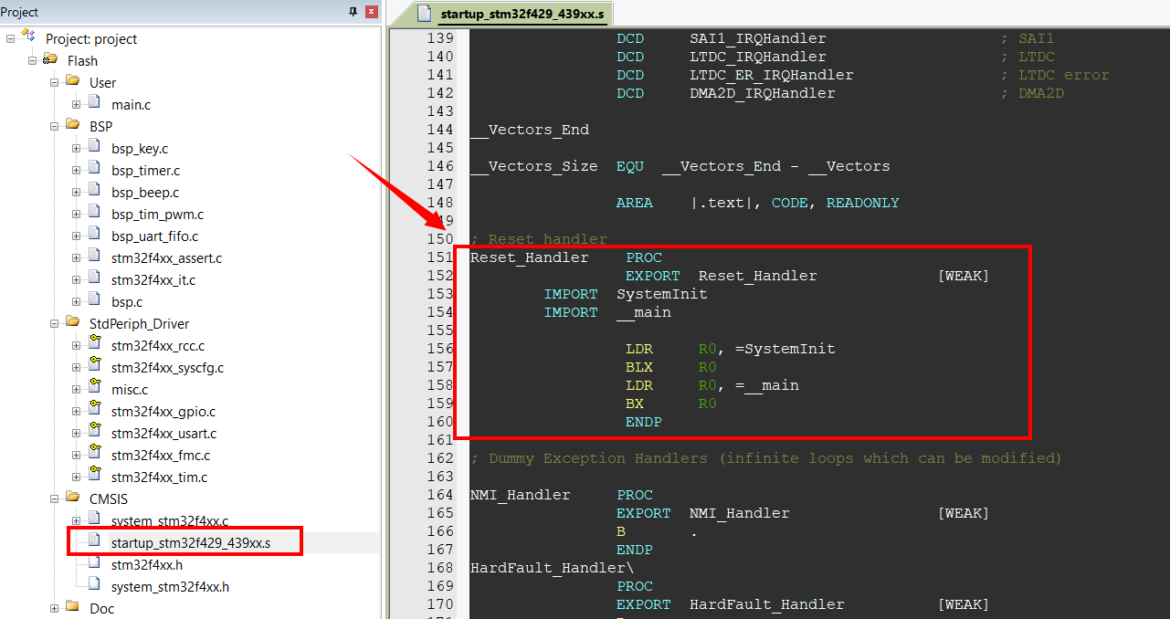 其实在按下单片机上面的复位按键之后。根据我么上一篇文章说的。系统会这些首先执行启动代码的里面的程序。