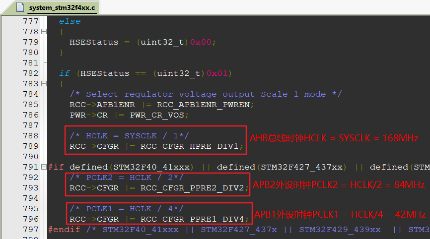 - 主时钟选择的是HSE高速外部时钟。 系统时钟 SYSCLK =PLLCLK= 168MHz AHB总线时钟HCLK = SYSCLK=168MHz APB1外设时钟PCLK1 = HCLK /4=42MHz APB2外设时钟PCLK2 = HCLK /2=84MHz