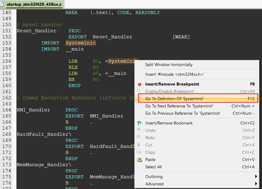 我们打开startup_stm32f429_439xx.s文件。当然我这里以F4为例,其他的也都是一样的。会看到在系统复位时候在执行main函数之前先执行了SystemInit函数。那我们现在看看SystemInit函数中都有啥。鼠标放在SystemInit函数上面右键选择Go To Defintion of SystemInit