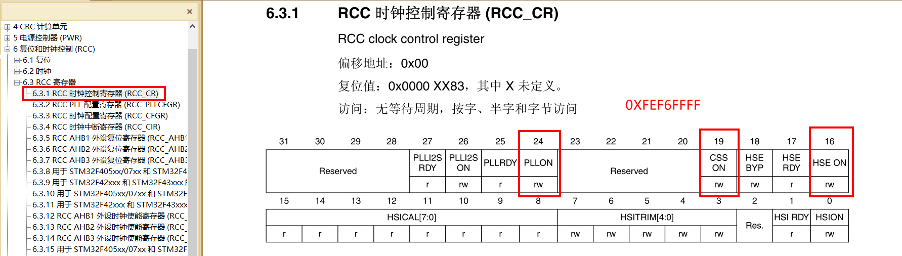 要会看宏定义: #define RCC_CR_HSEON ((uint32_t)0x00010000) 0x0001 0000。 就是把RCC寄存器的CR寄存器的HSEON置位1。根据 0x0001 0000可以知道HSEON处于CR寄存器的第16位,这一点很重要。