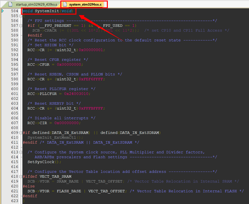 就会跳转到system_stm32f4xx.c文件中的SystemInit函数上来了。下面来一行一行分析: