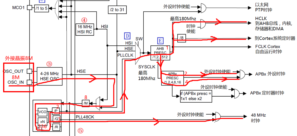 - ④HSI 是高速内部时钟,RC 振荡器,频率为 16MHz。可以直接作为系统时钟或者用作 PLL输入。
