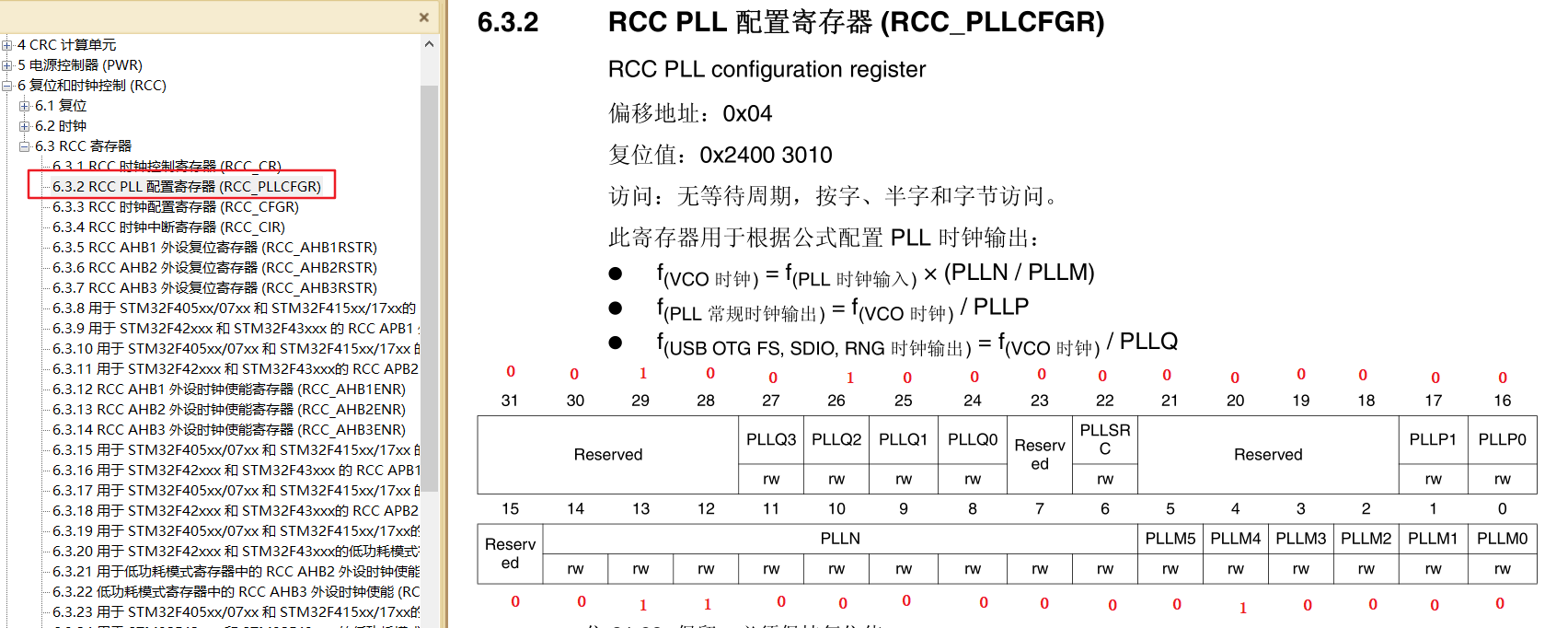 第601行:RCC->PLLCFGR = 0x24003010;复位RCC寄存器的配置PLLCFGR寄存器。具体的操作可以看下面对应的寄存器位值。