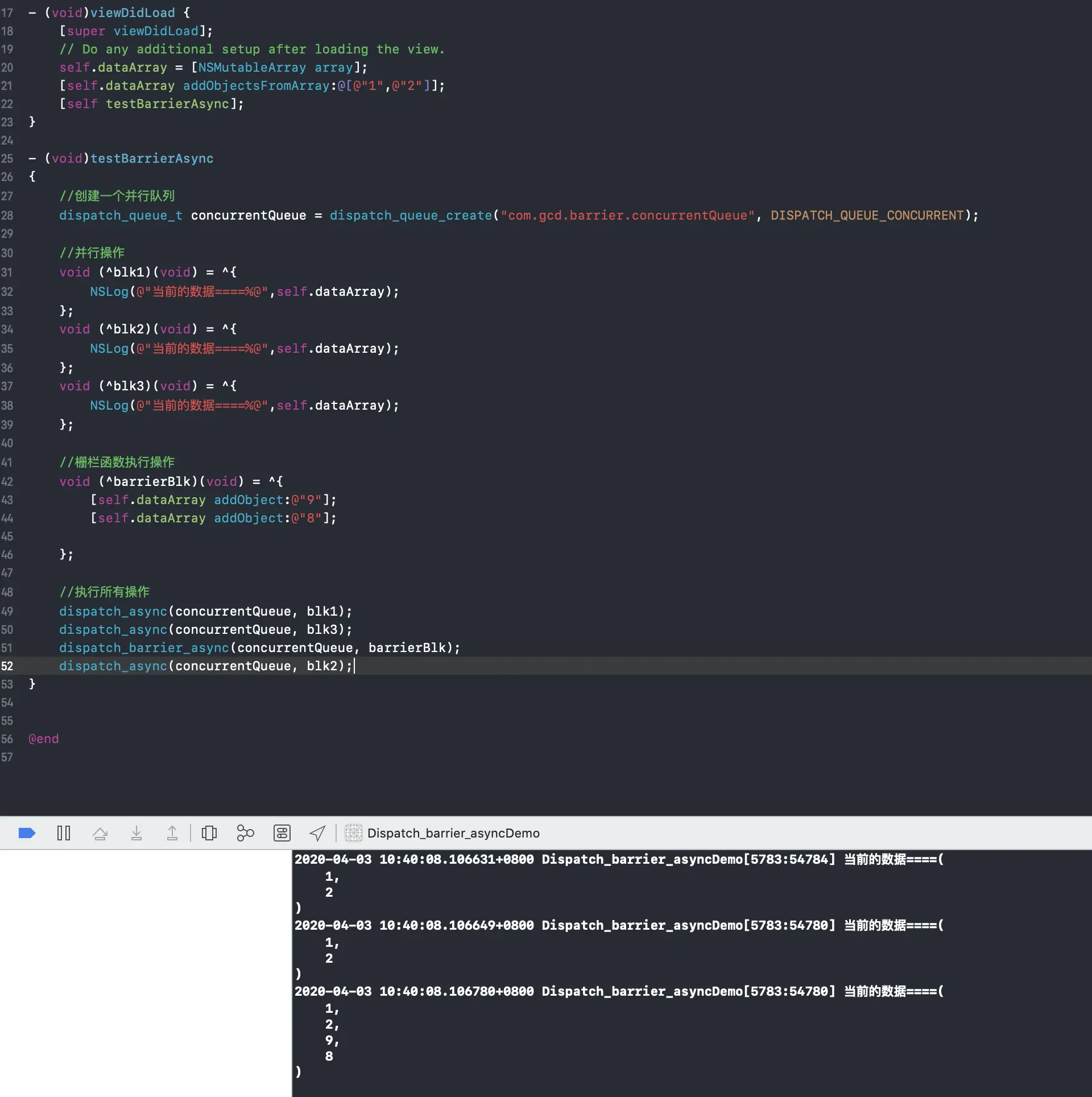 dispatch_barrier_async 函数可以方便的实现多读单写的需求,多线程同时读,但是只能一个线程写操作,并且在写操作完成之后才能继续读.