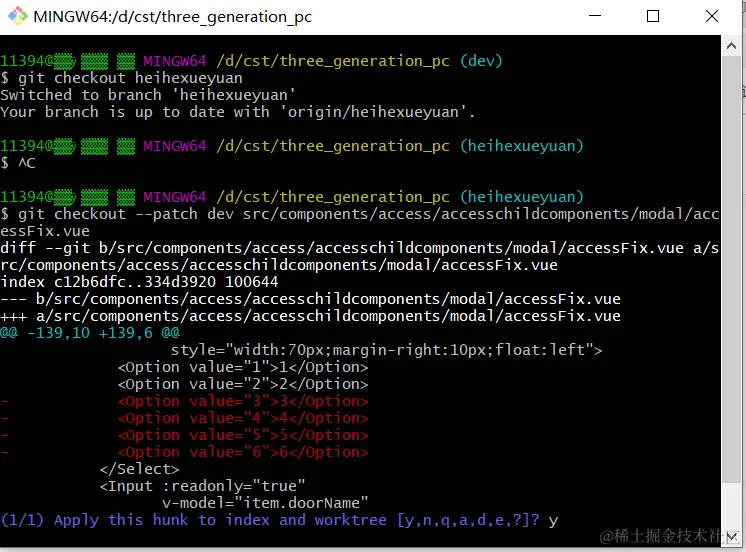 $ git checkout --patch dev src/components/access/accesschildcomponents/modal/accessFix.vue