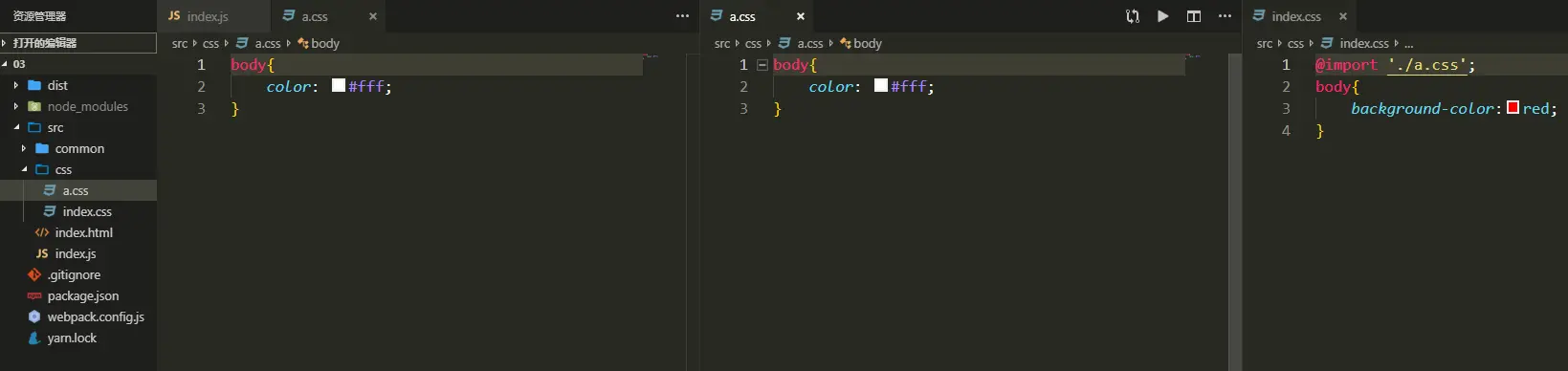 - 在src目录下新建一个css文件夹,并在css文件夹内新建「index.css」和「a.css」