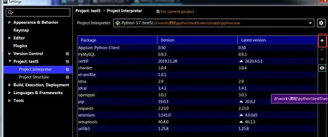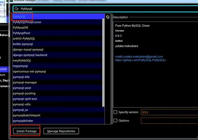 2、在Pycharm编辑器中安装:file--settings--Project Interpreter如下图点击+ 进入Available Packages 页面后搜索 PyMySQL,点击Install Package,出现successfully的字样表示安装成功(如下图)