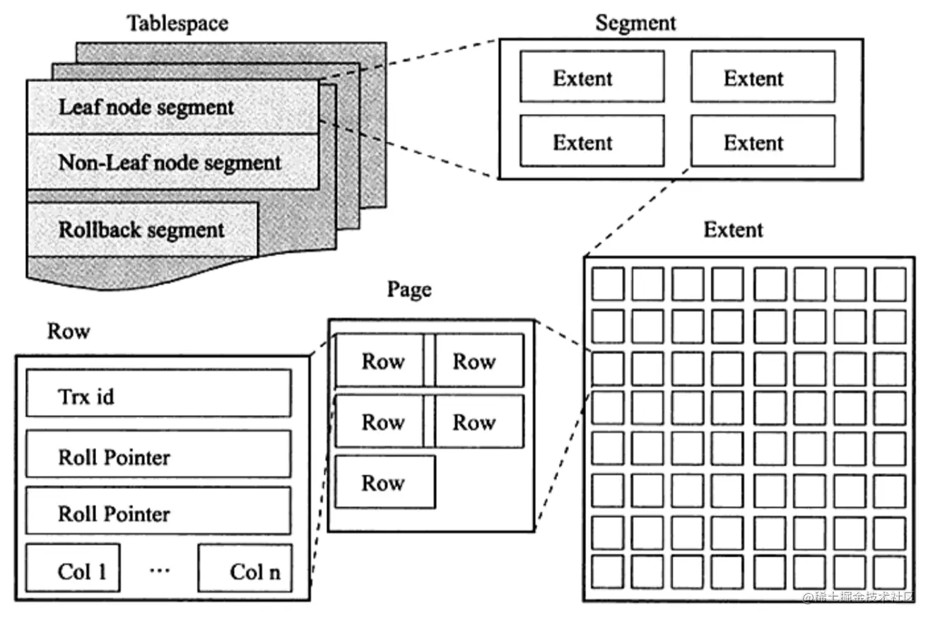 从 InnoDB存储引擎的逻辑存储结构看,所有数据都被逻辑地存放在一个空间中,称之为表空间(tablespace)。表空间又由段(segment)、区(extent)、页(page)组成。页在一些文档中有时也称为块(block), InnoDB存储引擎的逻辑存储结构大致如图所示。