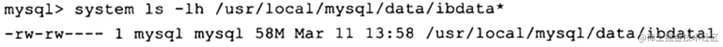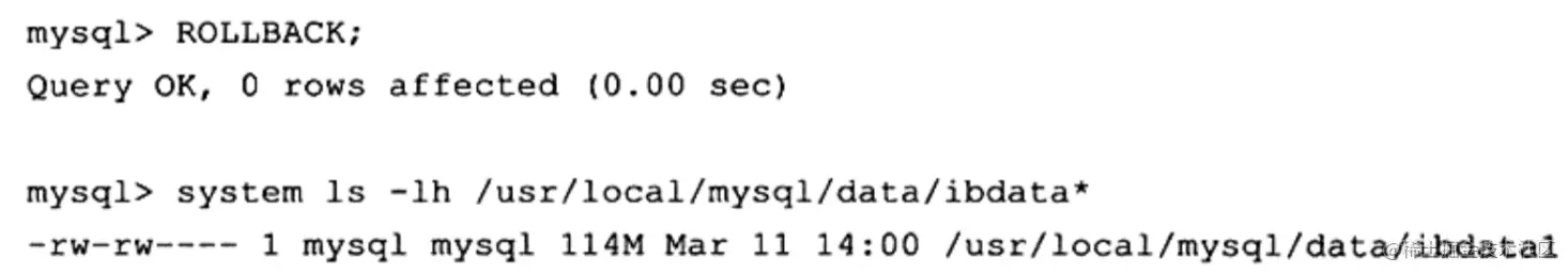 这里首先将自动提交设为0,即用户需要显式提交事务(注意,在上面操作结束时,并没有对该事务执行 commit或 rollback)。接着执行会产生大量undo操作的语句 update mytest set salary=0,完成后再观察共享表空间,会发现 ibdata1已经增长到了114MB。这个例子虽然简单,但是足以说明共享表空间中还包含有undo信息有用户会问,如果对这个事务执行 rollback, ibdata1这个表空间会不会缩减至原来的大小(58MB)?这可以通过继续运行下面的语句得到验证:
