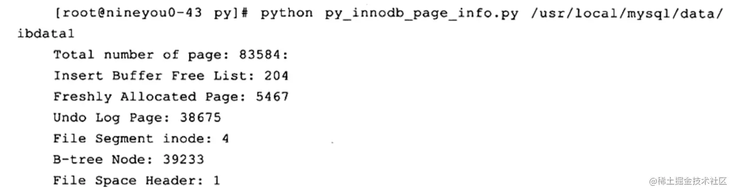 可以看到共有83584个页,其中插人缓冲的空闲列表有204个页、5467个可用页、38675个undo页、39233个数据页等。用户可以通过添加v参数来查看更详细的内容。由于该工具还在开发之中,因此并不保证在本书出版时此工具最终显示结果的变化。