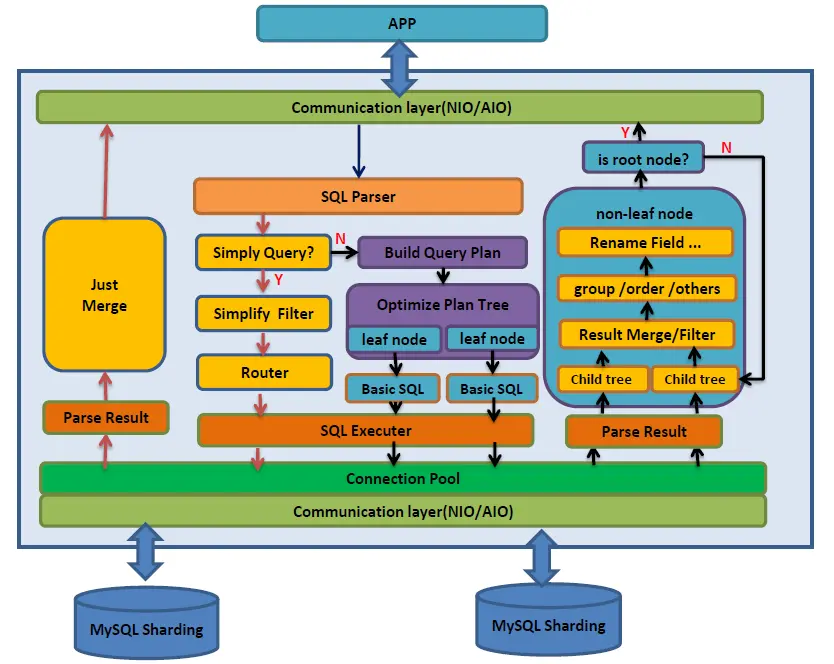 因此大部分的中间件都选择了自己实现SQL的解析器和查询优化器,下面是著名的中间件dble的实现示意图: