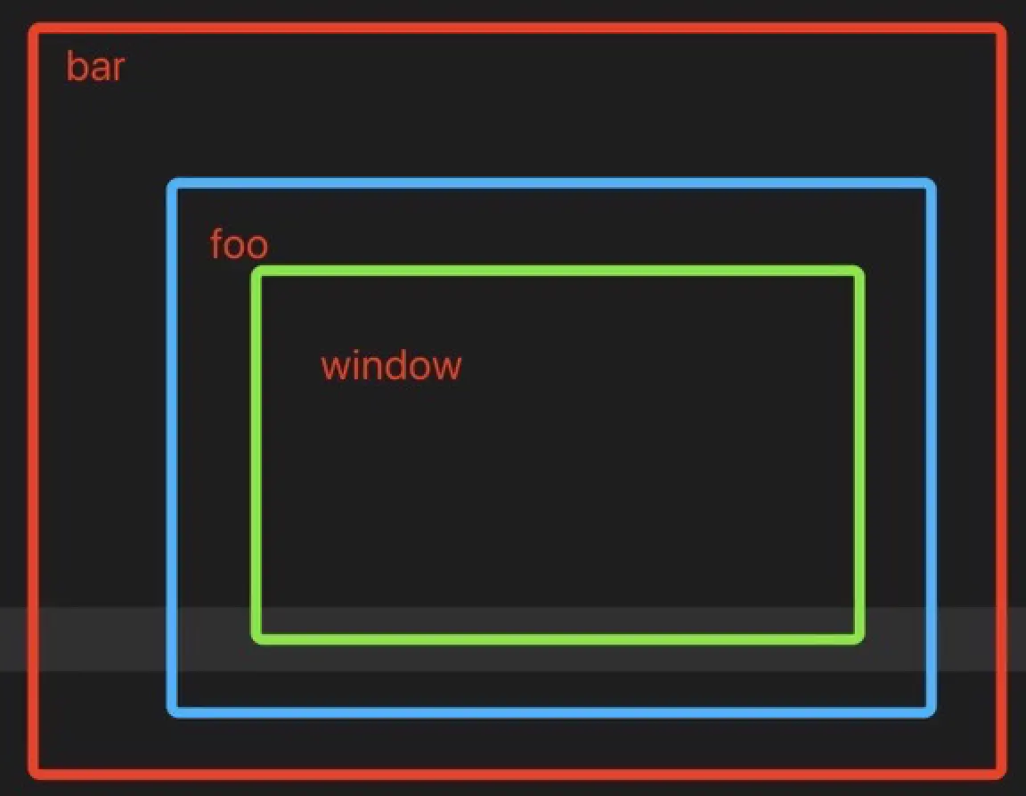 这是我理解的函数bar执行时候的作用域。区域window中为全局变量,这个例子包括我们声明的变量b,区域foo中包括变量a。在执行函数bar()时,到了console.log(a, b),会按照bar->foo->window的顺序去查找变量。这跟我们平时理解的从[1]冒泡到[2]然后是[3],有所区别,但本质上是一样的。