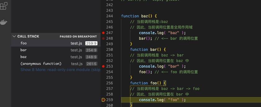 函数的调用栈可以看做函数调用链,在开发中我们可以从开发工具中查看函数的调用栈(下图是vs Code的调用栈查看)来分析函数的调用栈