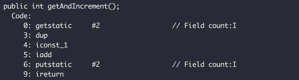 可以看到getAndIncrement方法就是1.加载count的值,2.与1相加,3.写回。