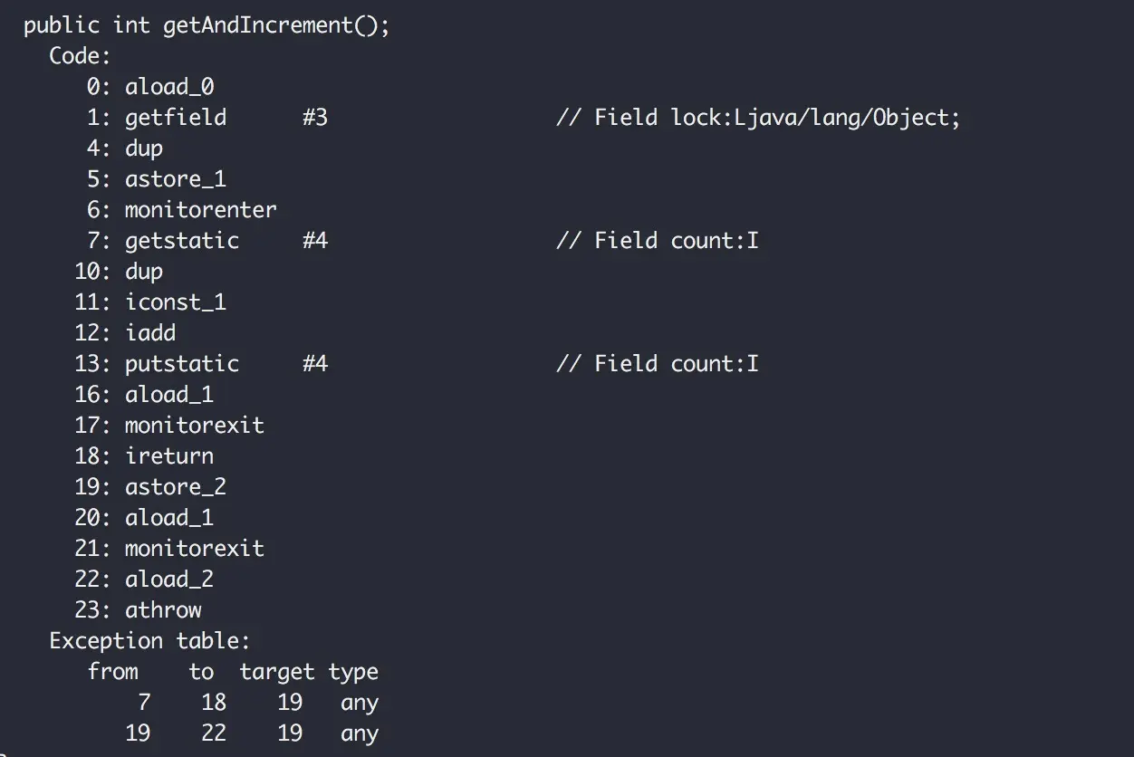 可以看到加了synchronized同步块之后,字节码里插入了1个monitorenter,2个monitorexit指令,而且原来的代码异常会被捕获,这样在异常时都能转到异常处理指令(19行)处处理,最终退出监视器对象。