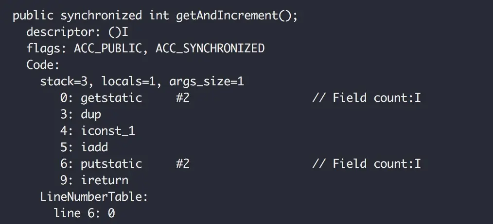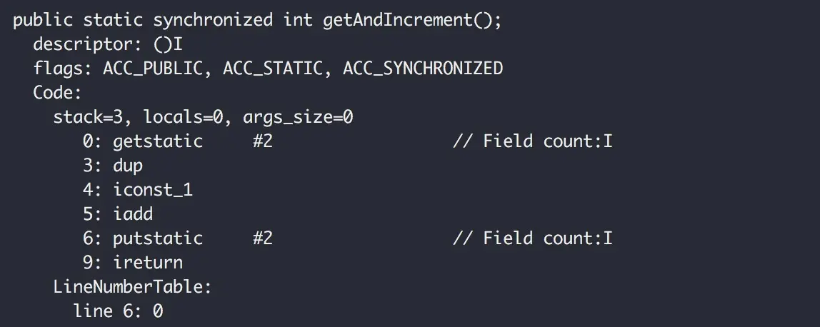 public class SynchronizedTest { private static int count; public synchronized int getAndIncrement() { return count++; } }字节码指令: