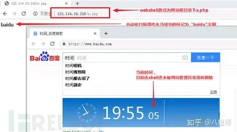 该网站确实为thinkphp5发开,当时webshell木马还在服务器上未被删除。可以通过服务器访问黑客上传的该木马,指纹信息为baidu,扫描器用这个指纹来自动判断getshell成功并记录url。
