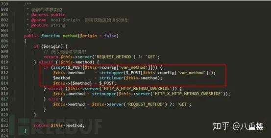 $method变量是$this->method,其等同于POST的“_method”参数值,可以利用覆盖$filter的属性值(filter属性保存了用于全局过滤的函数),从而实现代码执行。