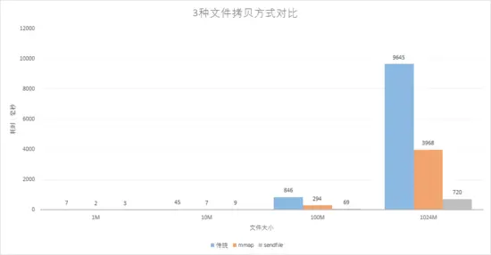 从上面测试结果可以看出,mmap 和 sendfile 的方式要远远优于传统的文件拷贝。对于 mmap 和 sendfile 在文件较小的时候, mmap 耗时更短,当文件较大时 sendfile 的方式最优。