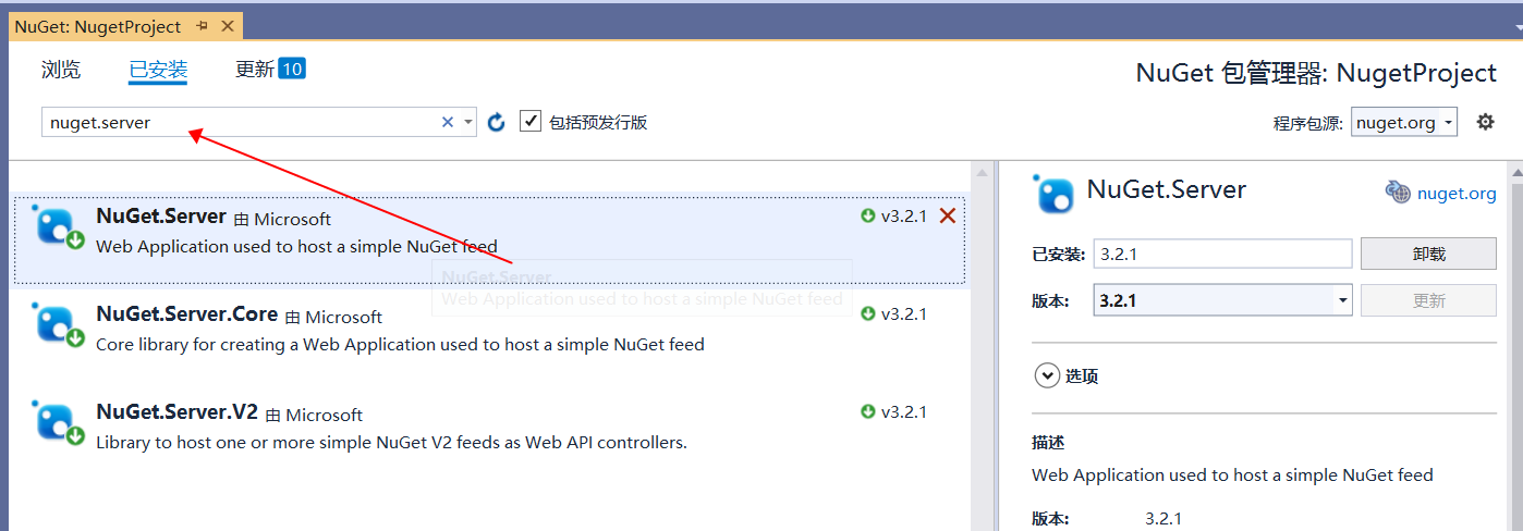 2.在nuget管理中 安装 nuget.server包