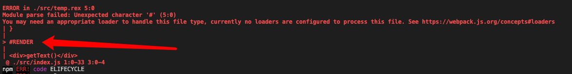 可以很明显的看出,这个报错是无法识别 #RENDER 这种语法,而且也非常亲切的告诉你,可以对这种文件类型增加 loader,甚至还指出了 loader 的具体使用方式的文档地址