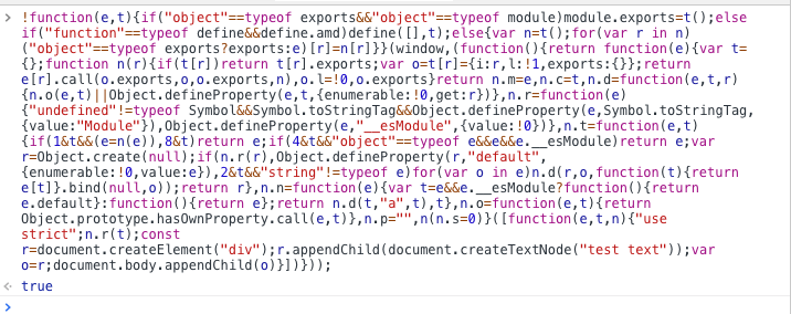 执行 npm run build 可以得到一堆奇怪的代码,将这一堆奇怪的代码放在浏览器下运行,就会发现 body 下面多了一行 div