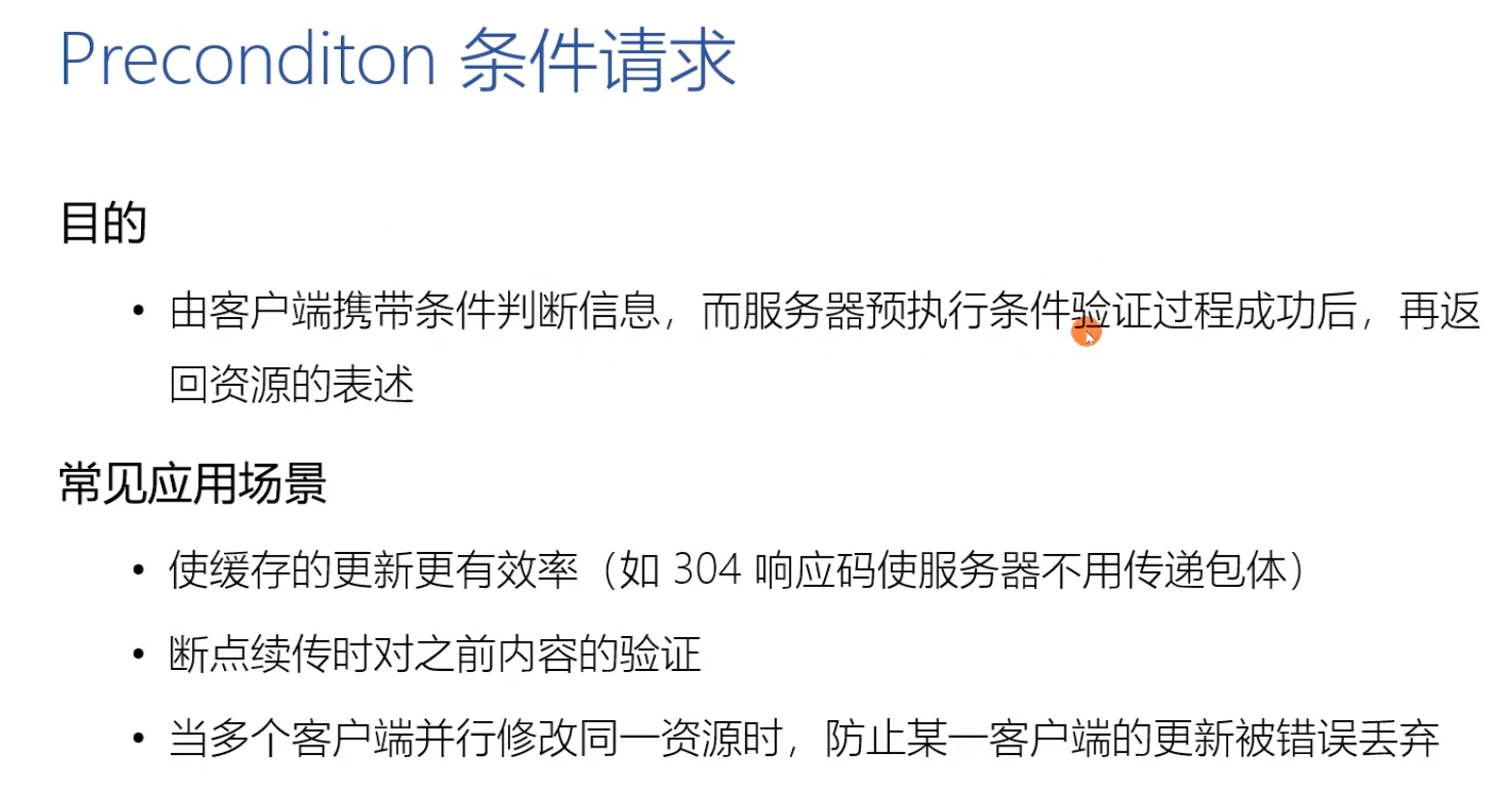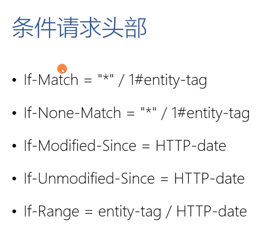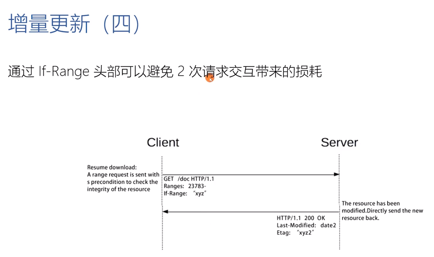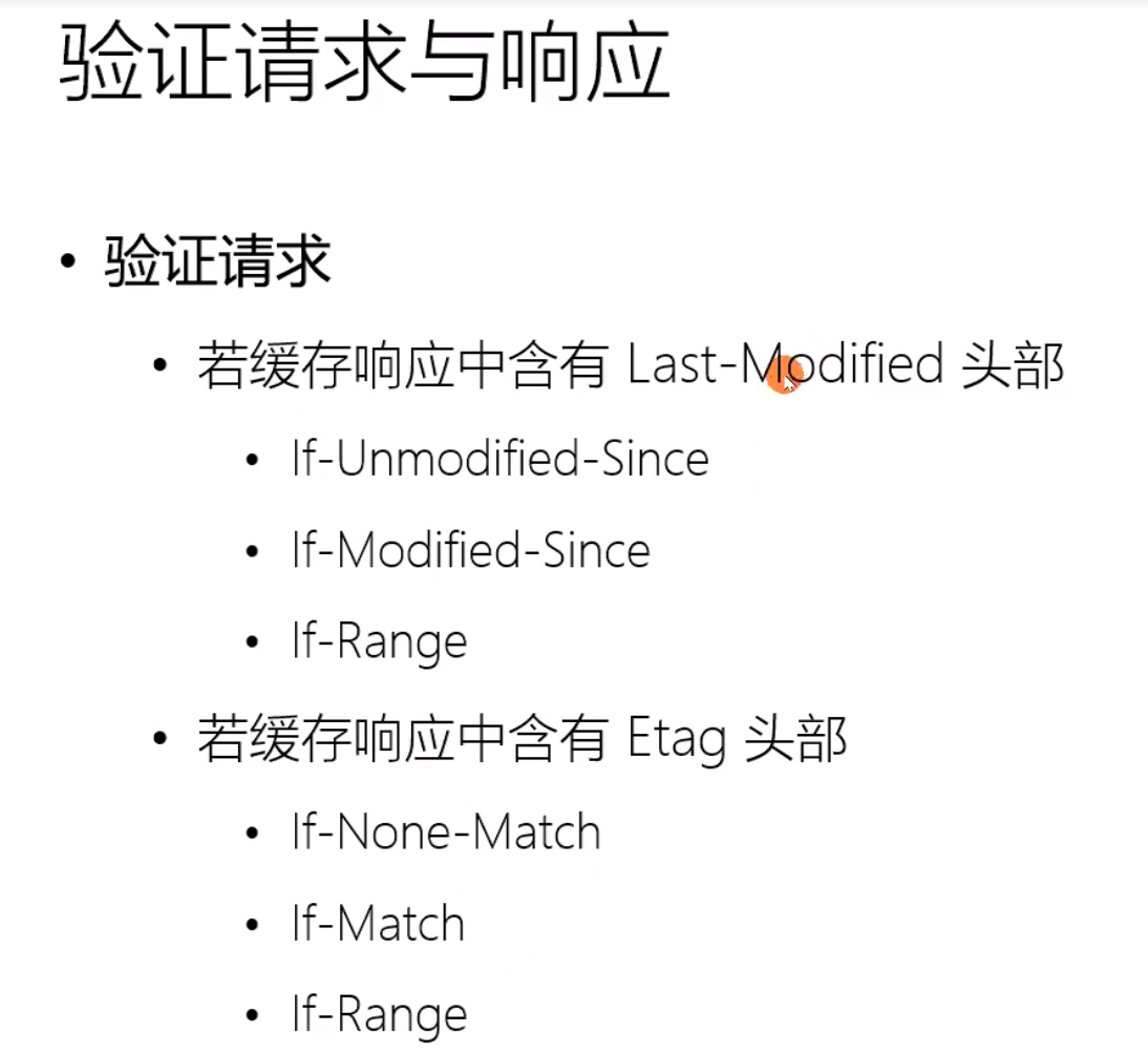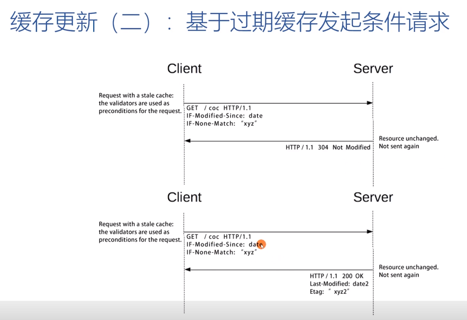 Etag与If-None-Match: 第一次请求返回ETag作为资源的标志符,第二次相同请求如果携带if-None-Match请求头服务器会对比请求头内的ETag与请求资源的ETag,如果相同说明资源没有改变,验证失败了,对于GET/HEAD方法返回304,对于能够引发服务器状态改变的方法,则返回 412。