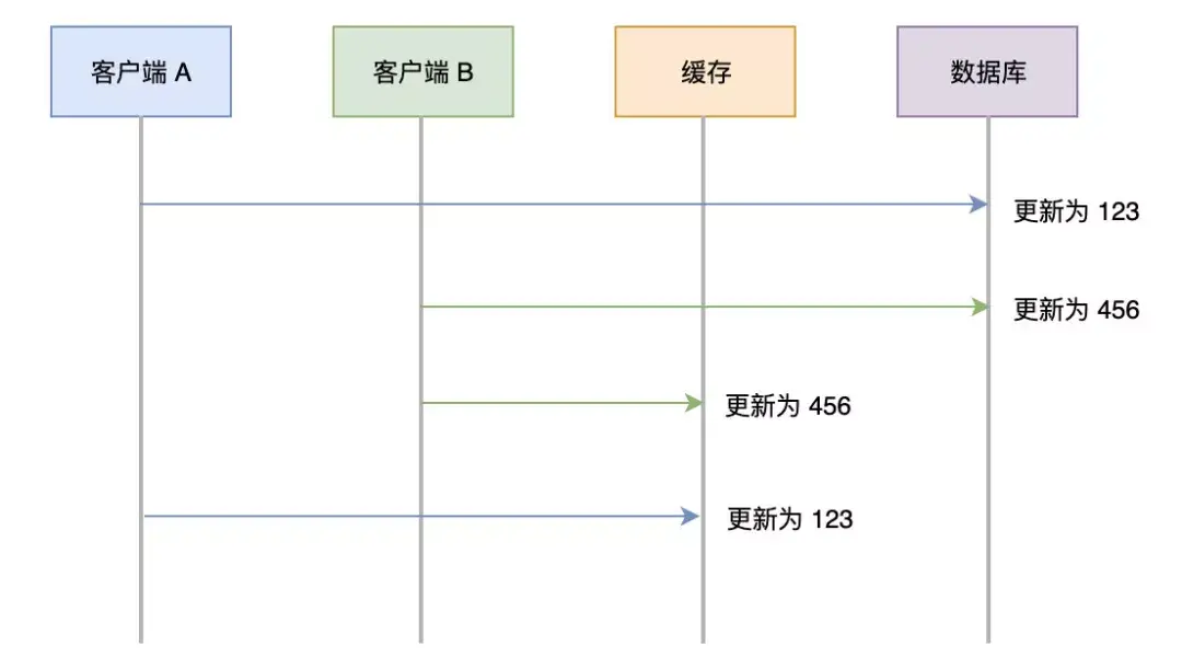 A 先把数据库更新为 123,由于网络问题,更新缓存的动作慢了。
