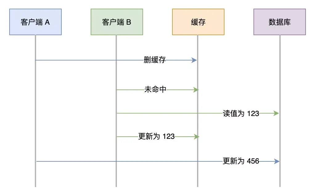 A 先删了缓存,还没等数据库更新完成呢,就被 B 把缓存更新为了旧值。