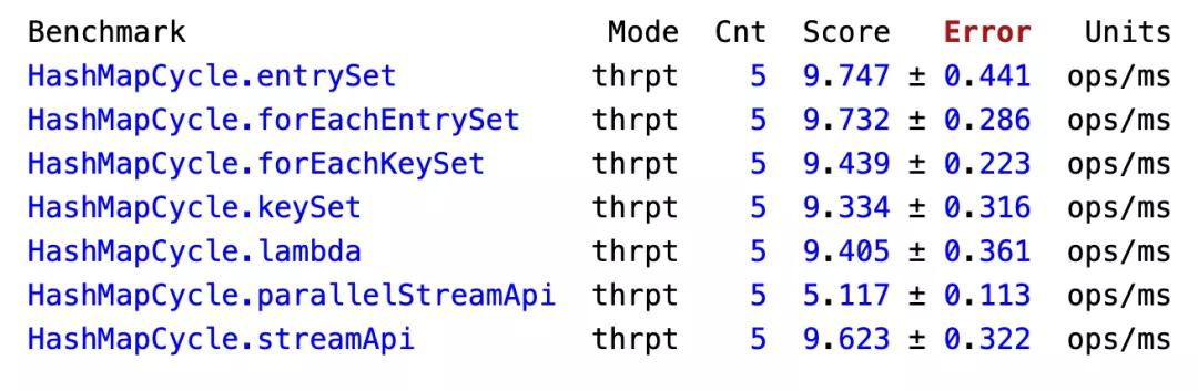 其中 Score 列表示平均执行时间, ± 符号表示误差。从以上结果可以看出,如果加上后面的误差值的话,可以得出的结论是,除了并行循环的 parallelStream 性能比极高之外(多线程方式性能肯定比较高),其他方式的遍历方法在性能方面几乎没有任何差别。