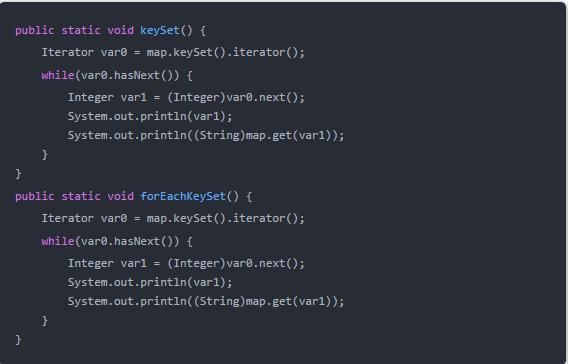 而通过迭代器和 for 循环遍历的 KeySet 代码也是一样的,如下所示: